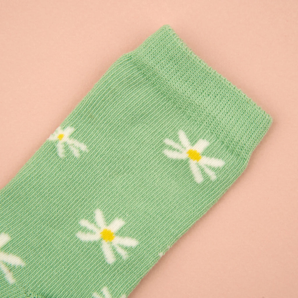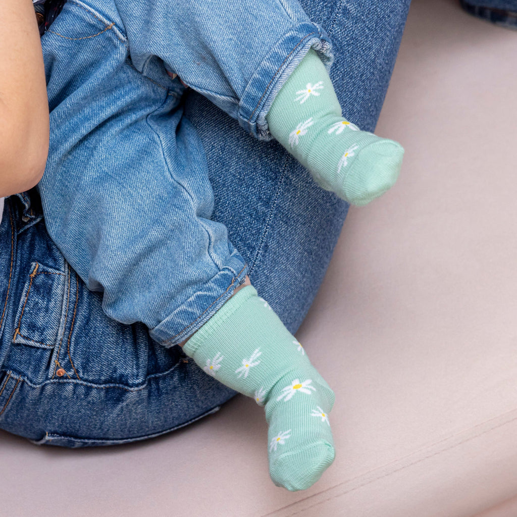 Pour les adorables petons de nos bébés, on opte pour la version miniature des chaussettes pâquerettes. De jolies fleurs blanches sur un délicat fond vert d’eau. Tout ce qu’il faut pour garder nos petit.e.s au chaud et faire des matchy-matchy des plus chous !