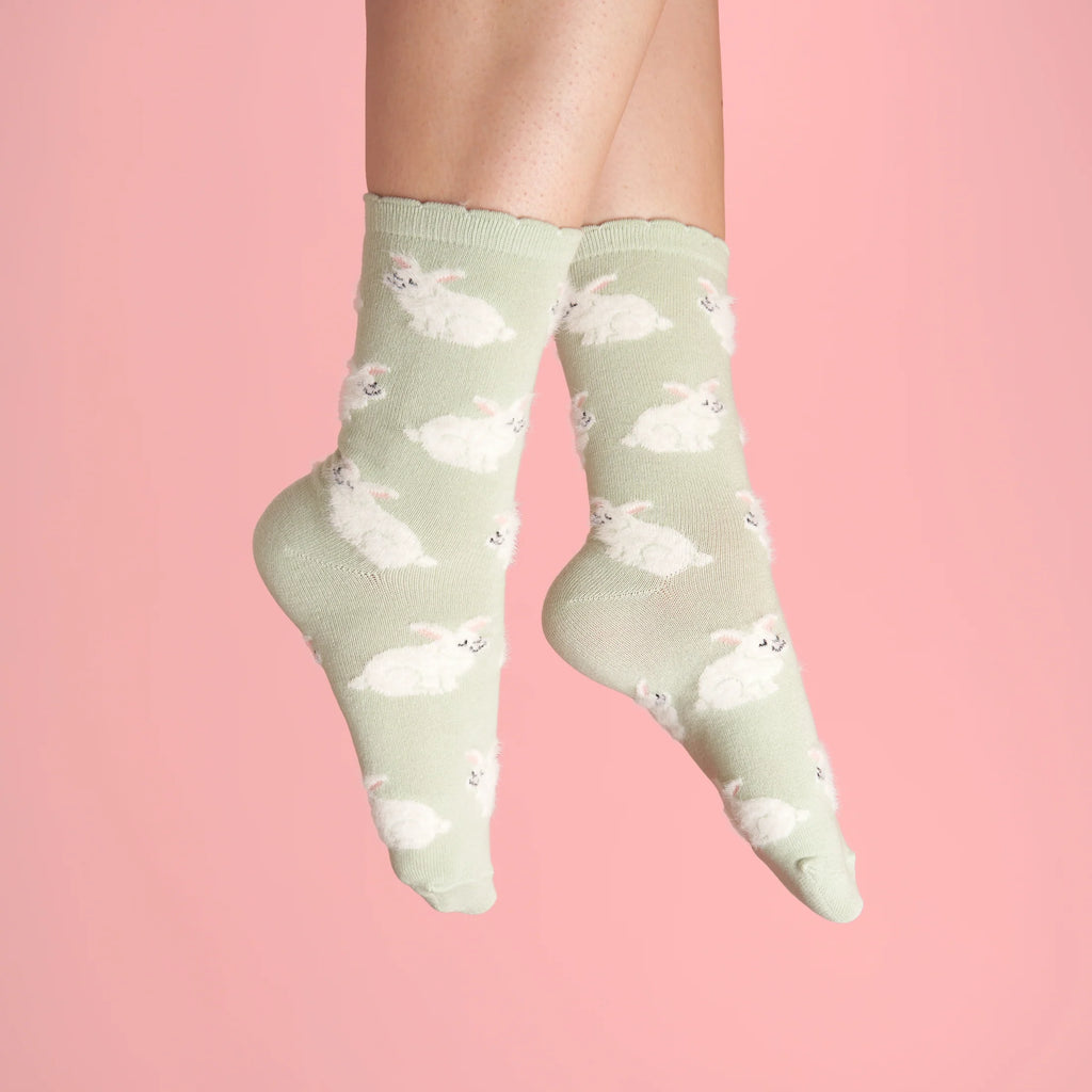 Quand la vie manque de douceur, ajoutons-y des chaussettes poilues ! Un accessoire original au motif de lapins blancs comme neige avec supplément pelage plus vrai que nature. On adore le fond vert sauge et le détail des fronces à nos chevilles. Ça réveille comme une envie de gambader dans les sous-bois.