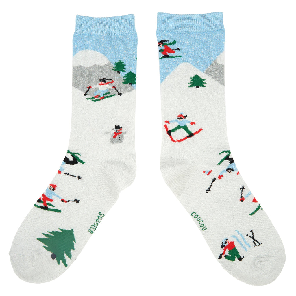 Les chaussettes parfaites pour cet hiver. On adore cette petite scène de vie à la montagne avec des skieurs de tous niveaux, le tout à paillettes bien sûr !