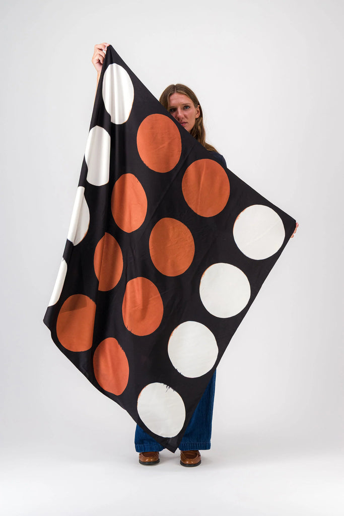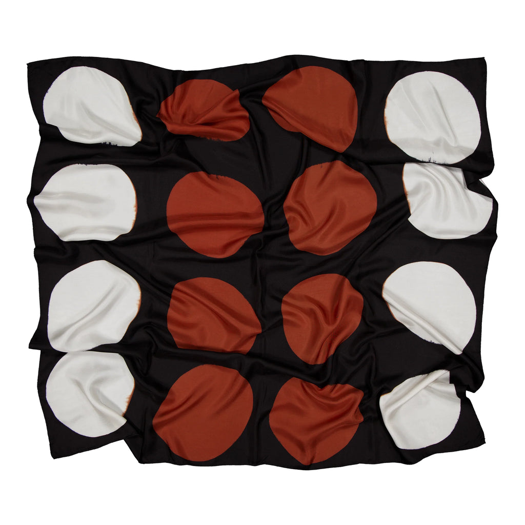GRAND JEU, un carré de soie au motif géométrique intense et vibrant réalisé en teinture artisanale.