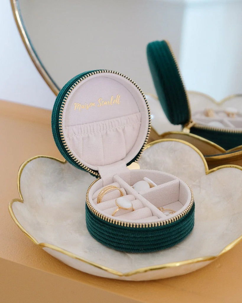 Yvonne en velours côtelé est la boîte à bijoux de voyage idéale et deviendra sans nul doute l’alliée de toutes vos aventures ! C'est un petit format très fonctionnel pour vos activités quotidiennes. Elle est mignonne, compacte et se glisse aussi bien dans un sac à main que dans une valise.