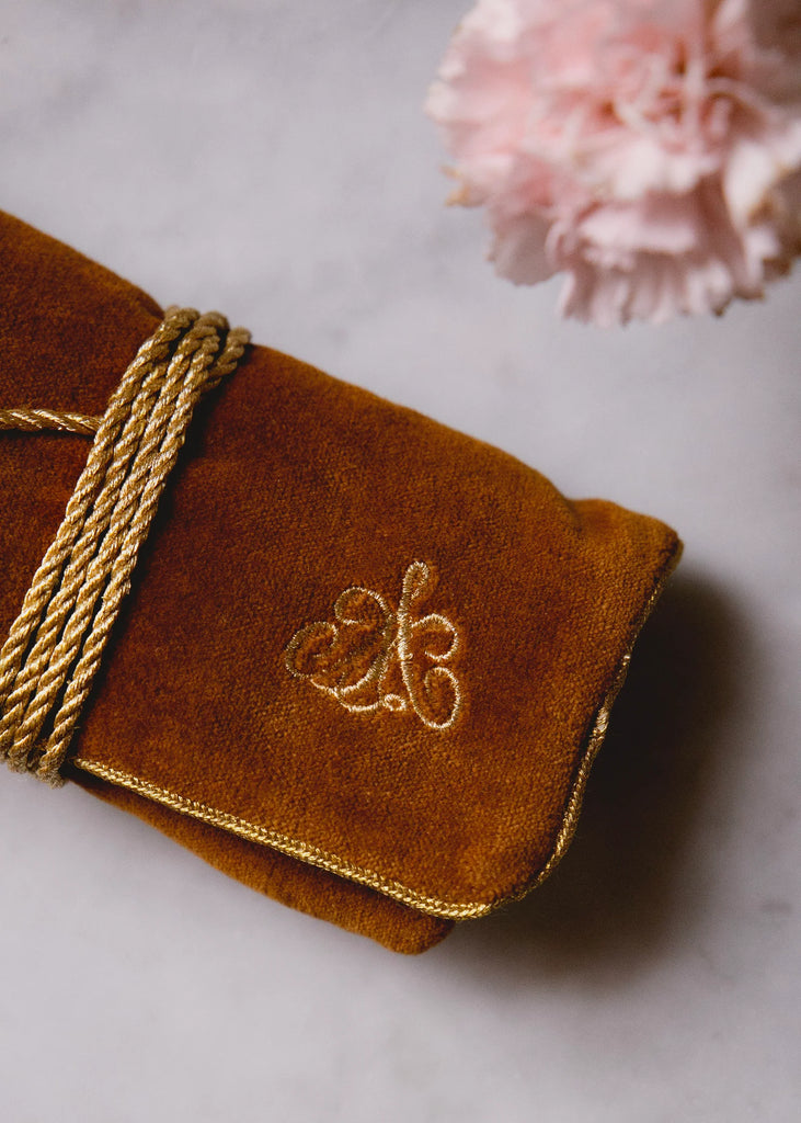 Trousse à bijoux en velours ocre brodée aux fils d'or.