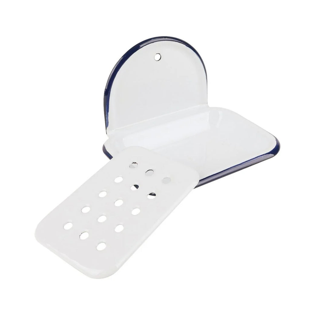 Porte-savon en émail à fixer au mur. Couleur blanche avec le traditionnel liseré bleu peint à la main.