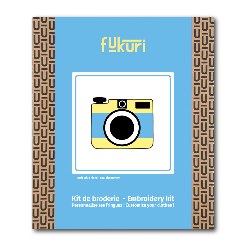 Un kit pour broder un mignon petit appareil photo. Il permet d'apprendre à broder soi-même un vêtement !