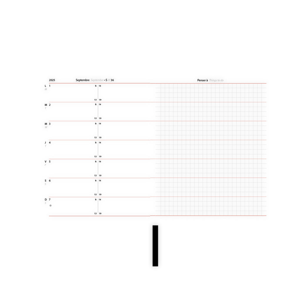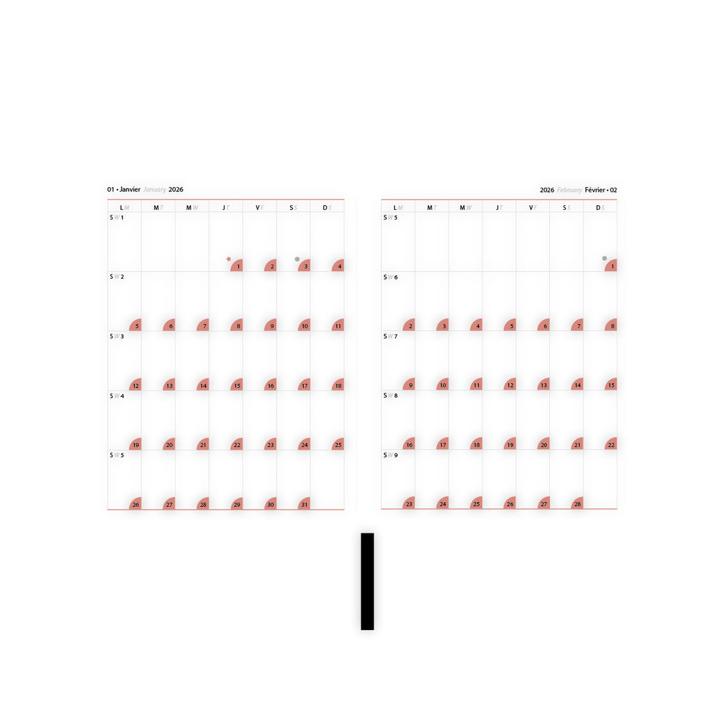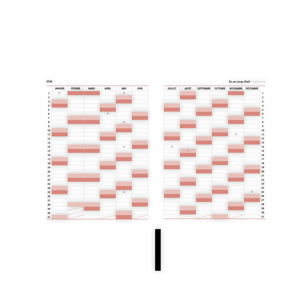 Page coup d'œil sur l'année et pages mois par mois pour une visualisation rapide des jours et dates, des jours fériés.