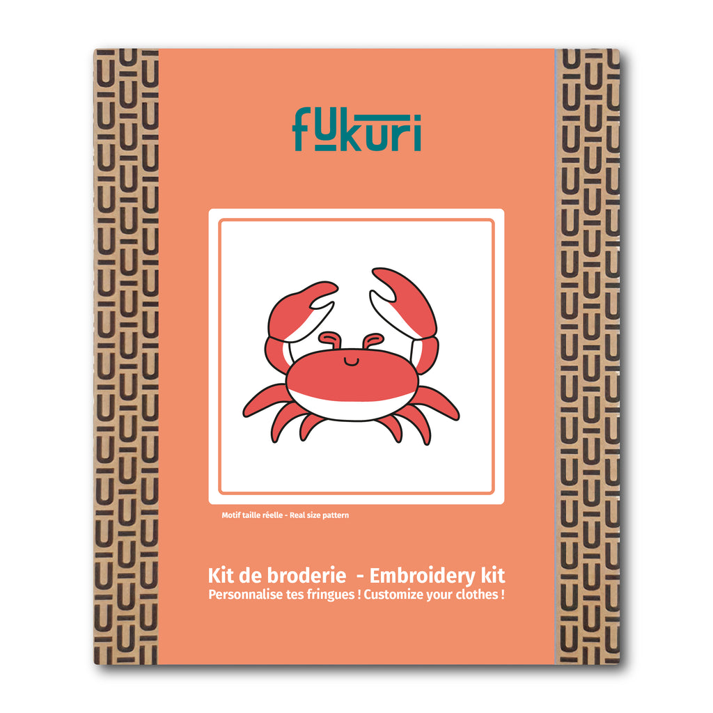 Un kit pour broder un mignon petit crabe. Il permet d'apprendre à broder soi-même un vêtement !