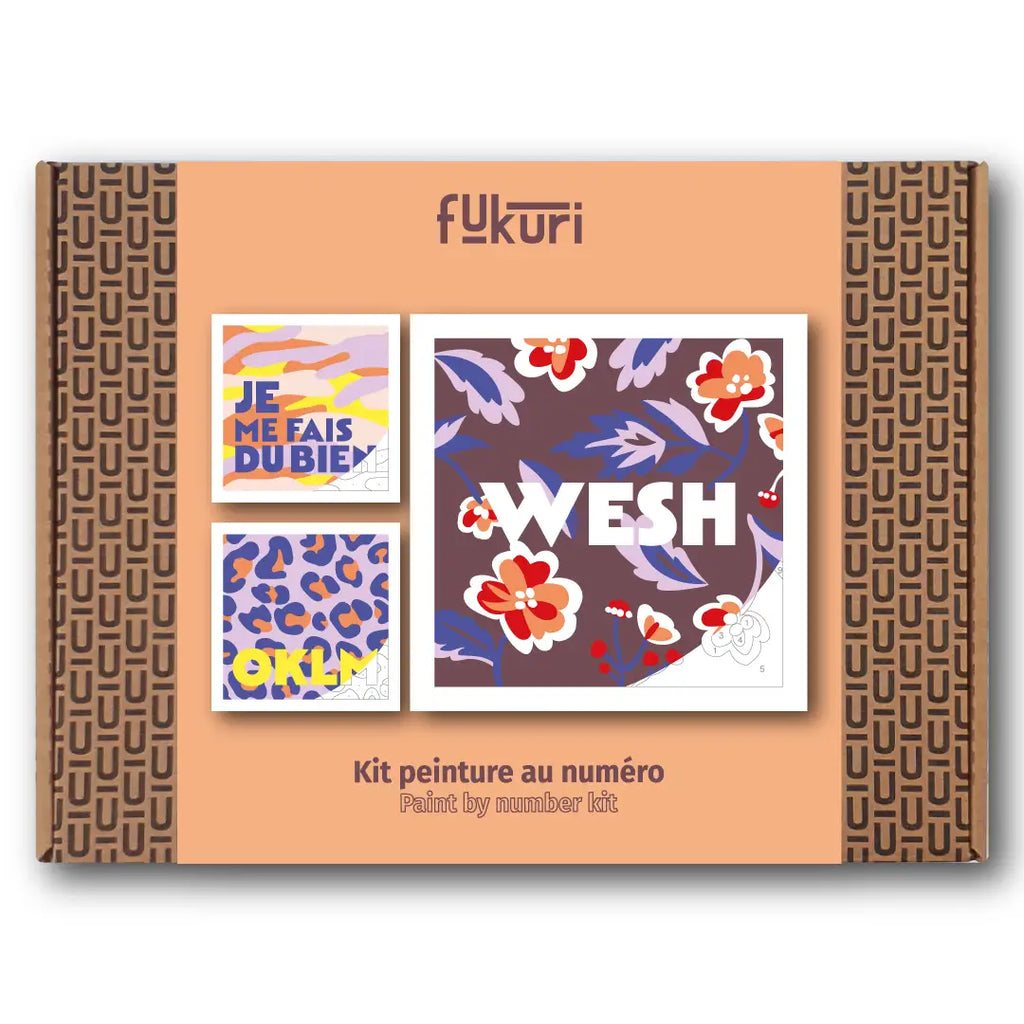 Trop stylé ce kit de peinture au numéro aux motifs originaux. Tu peins en associant les coloris aux numéros. Les cartes de ce thème mettent à l’honneur des motifs pop colorés aux messages fun : WESH, OKLM (Au calme), Je me fais du bien.