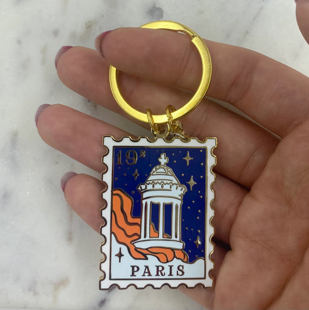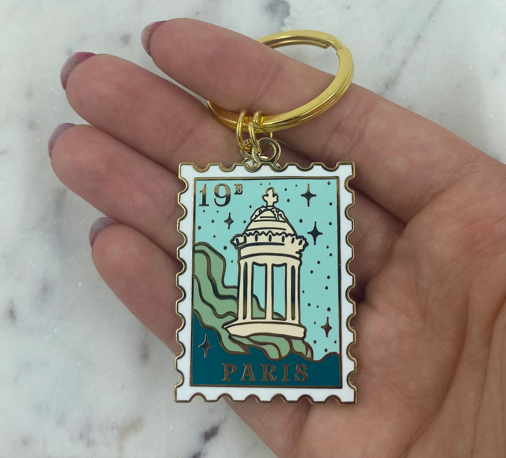 Ce porte-clés en forme de timbre illustre le Parc des Buttes-Chaumont, avec son célèbre belvédère perché au-dessus du lac. Poétique, urbain, un peu magique.